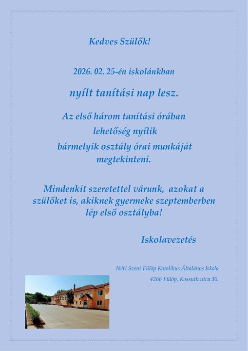 Feltöltöttem a fájlok közé a Néri Szent Fülöp Katolikus Általános Iskola Éves munkatervében szereplő hónapokra lebontott programtervet a 2025/26-os tanévre vonatkozóan. Feltöltöttem még az 1. félévre vonatkozóan a nevelők fogadóóráit, melyre szeretettel várjuk a szülőket!A változtatás jogát fenntartjuk!